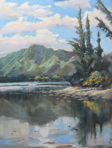 This painting was done "Plein Air," which means outside, on location.  While doing Plein Air, one must capture the essence of each scene quickly as everything the artist sees from color to shadows changes.